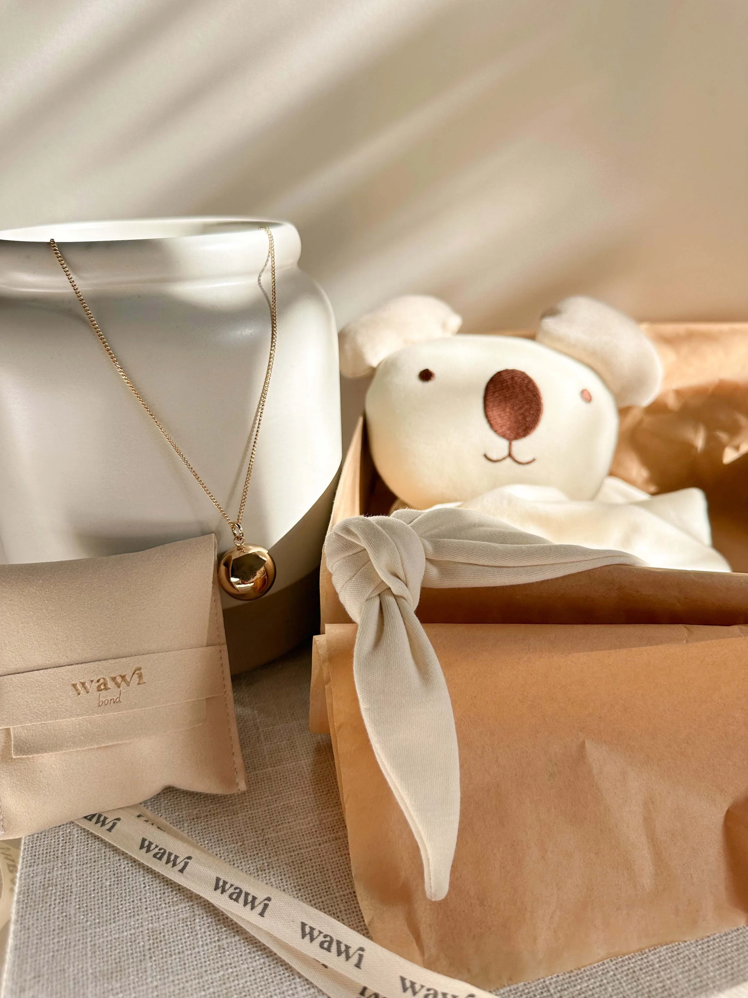 Our necklace hangs longer - with an additional jumpring to adjust length - allowing the pendant to rest close to the mom's belly, creating a gentle connection between mother and baby. After the birth of the baby, this removable ball is placed into our 100% Peruvian pima cotton lovey’s head, so the baby can continue to listen to the soothing chime.